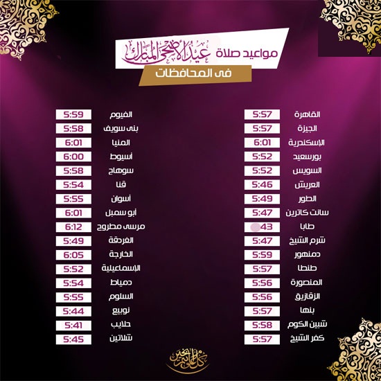مواقيت الصلاة يوم عيد الأضحى بمصر ومواقيت صلاة العيد بجميع المحافظات والمدن المصرية