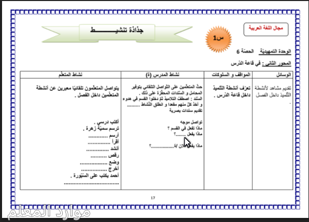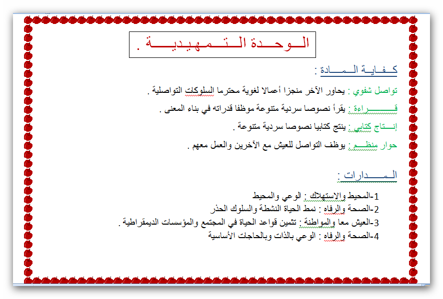 مخطط الوحدة التمهيدية سنة أولى موارد المعلم