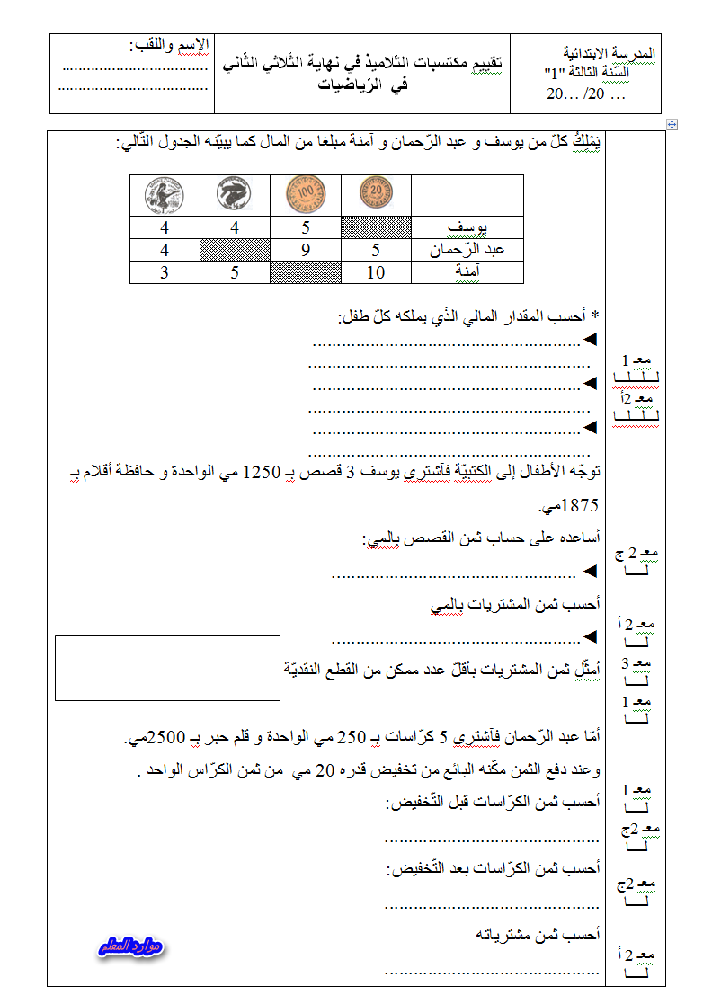 مادة الرياضيات امتحانات السنة الثالثة ابتدائي تونس الثلاثي الثالث Pdf